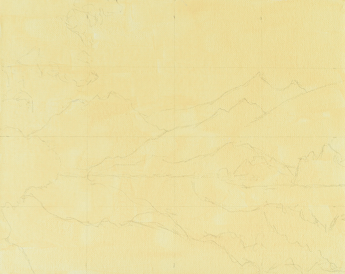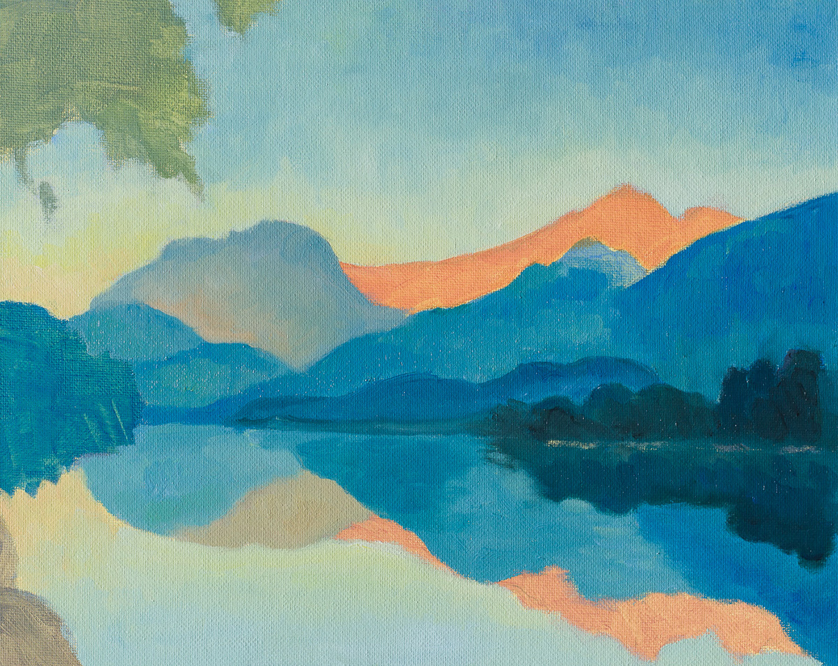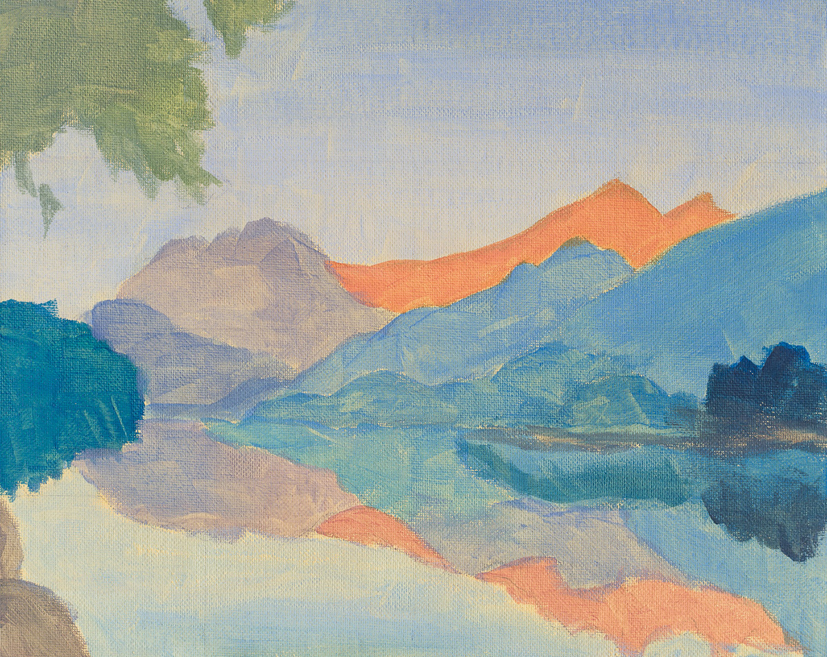 Auf den ersten Blick erscheinen die Anforderungen an die Umsetzung überschaubar. Ein hellblauer, ins Cyan neigender Himmel, am Horizont ins Gelb übergehend, ein orangefarbener Berg, eine blaue Bergkette, links noch eine dunkle bewaldete Insel oder ein Küstenstreifen, unten links Steine eines angedeuteten Ufers und oben links ein Stück Baumwipfel. Fast alles ist gespiegelt und dazu noch in einer eher flächigen Malweise realisierbar, wie gemacht für eine Primamalerei auf weißem Bildträger.