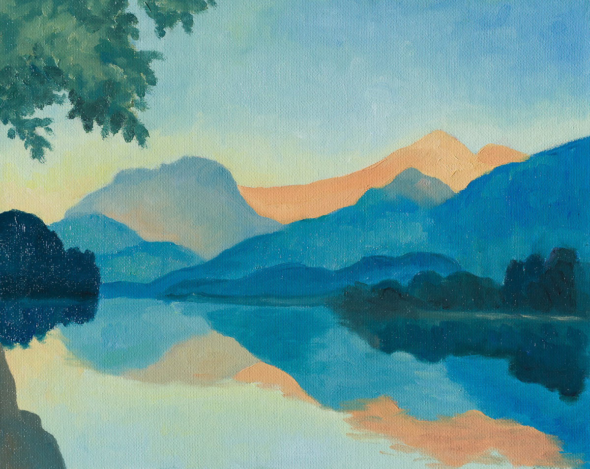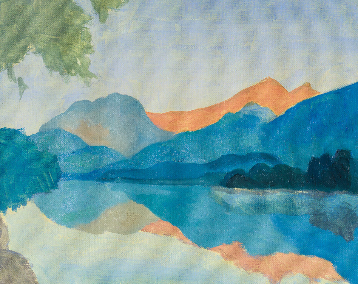 Hier ist es der erste Eindruck, der gerade bei Anfänger:innen in der vermeintlich einfachen Umsetzung oft zu frustrierenden Malerlebnissen führt. Was da auf den ersten Blick so flächig bis plakativ und simpel erscheint, erweist sich in den subtilen, feinen Abstufungen von Farb- und Tonwerten als eine der anspruchsvollsten Übungen – vielleicht sogar die schwierigste, die in guter Qualität im Zeitrahmen des Kunstunterrichts kaum umzusetzen ist. So besteht beispielsweise die dominierende Bergkette eben nicht aus einer homogenen blauen Fläche: während sie am rechten Bildrand mehr Ultramarinblau enthält, verändert sich der Farbton nach links subtil ins Cyan und wird dabei auch etwas heller, um vor dem bewaldeten Insel- oder Küstenstreifen wieder dunkler auszulaufen. Die Fläche ist auch nicht homogen, sondern zeigt Unregelmäßigkeiten, die für eine lebendige Struktur sorgen, ohne die eindeutige Dominanz von sichtbaren Pinselstrichen zu haben. Ähnliches gilt für die niedrigen Berge oder Hügel im Uferbereich, hier kommen noch subtile Grüntöne in unterschiedlichen Tonwerten dazu. Der Baumwipfel allein zeigt so viele Details, dass er mehrere Stunden der Umsetzung mit einem feinen Pinsel in Anspruch nehmen könnte.