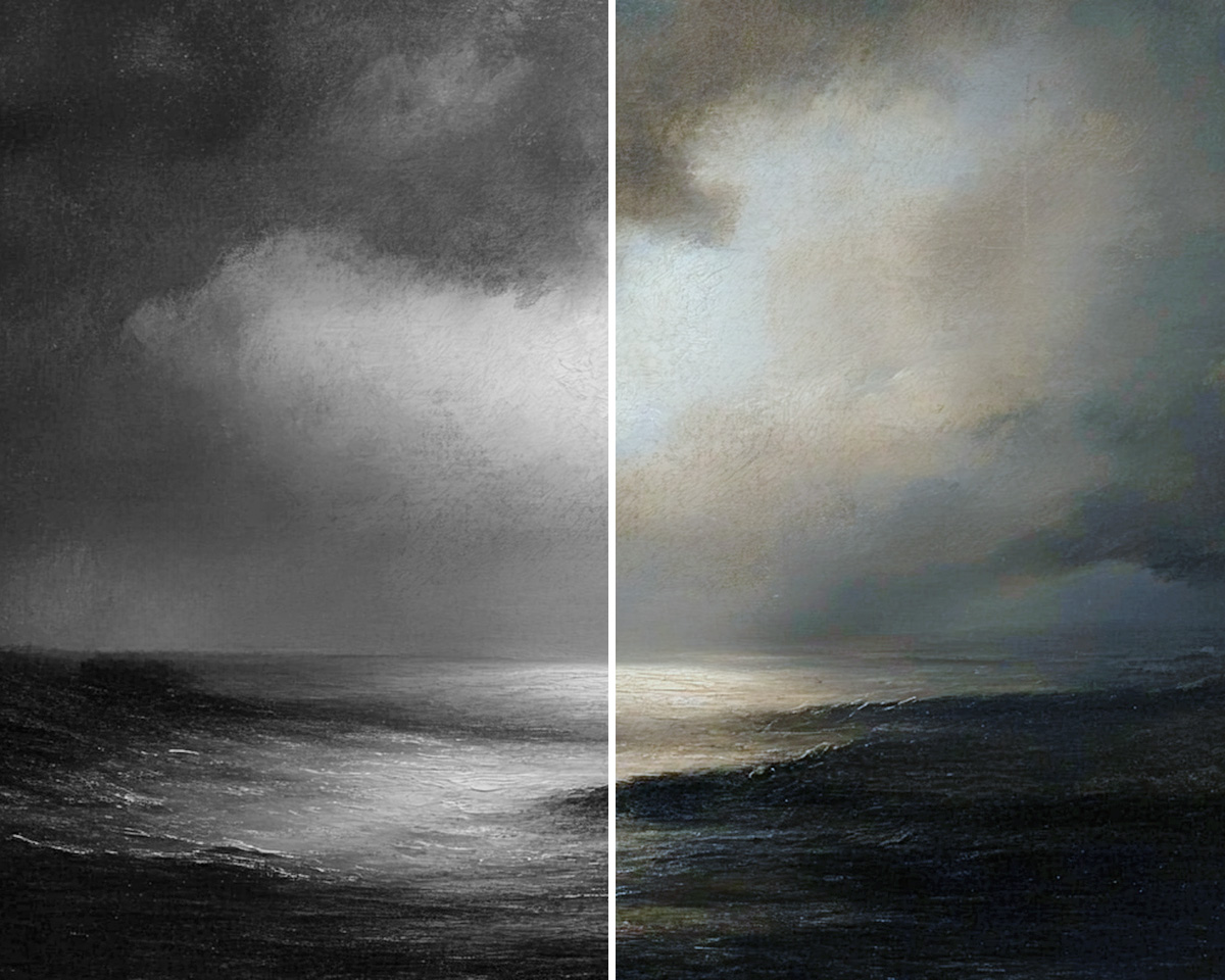 können, wird mit diesen ersten Ölfarbschichten die graue